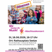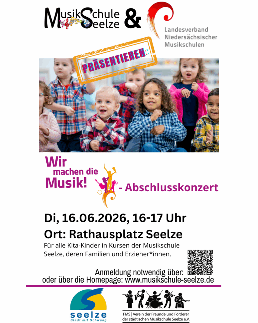 Alle Kinder aus unseren Kita-Kursen “Wir machen die Musik” sind mit ihren Familien und ErzieherInnen und Kita-Leitungen herzlich eingeladen zum großen Abschlusskonzert auf dem Rathausplatz Seelze.